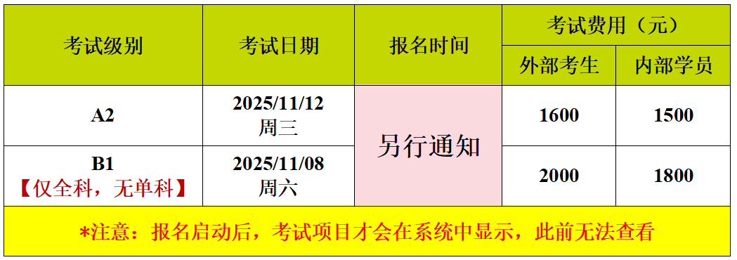 2、此轮公告仅公布考试日期,内部学员及外部考生的报名工作将于10月启动。