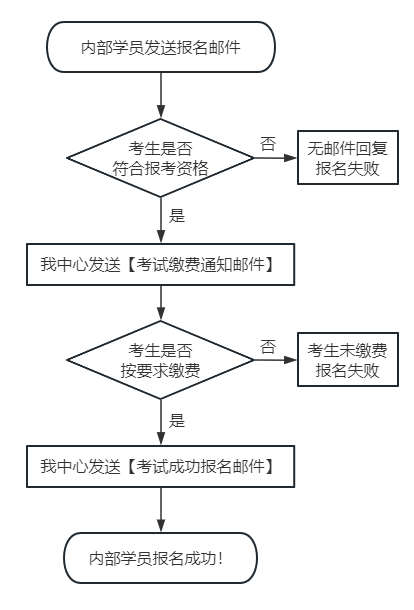 5. 考生按照邮件通知中的要求完成全部报名流程后,我中心将会发送【考试成功报名邮件】作为考生报名成功的凭证。考生收到该邮件后,内部学员的当次优享考位资格即视为已使用。报名流程图示如下: