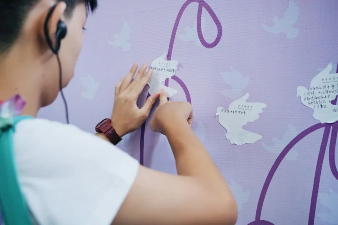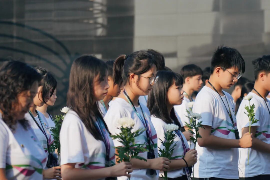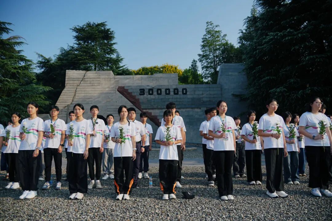 9月5日上午,港澳师生在侵华日军南京大屠杀遇难同胞纪念馆举行了庄严的悼念活动。公祭广场上,港澳师生举行了升旗仪式,共同撞响和平大钟,通过敬献花圈、默哀等表达对遇难同胞的深切哀悼。走进“南京大屠杀史实展”,港澳师生从大量珍贵历史照片、实物证据、档案文献及影像资料中,系统全面地了解了这场人类浩劫的历史真相。南京大屠杀历史记忆传承人夏媛在现场为港澳师生动情讲述,通过家族记忆和历史研究的结合,让这段民族苦难史更加可感可知,同学们听后热泪盈眶。之后还举行了“祭忆之声”诵读活动,在朗读《拉贝日记》《魏特琳日记》节选中,同学们深切感受到历史的温度与重量。和平鸽花墙上,港澳学生郑重留言,“参观完本次活动,我很感谢祖国给予我们如此快乐的生活环境,我们每个人都应该把这段历史铭记于心,用自己的力量把祖国变得更强大”。